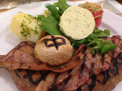 Als hoofdgerecht bestel ik een zeldzaam gerecht: kalfslever anglaise (€ 24,50). Dat zijn gegrilde kalfsleverplakken met daarop eveneens gegrild ontbijtspek. Ik begin ondertussen de huisstijl als boers te omschrijven want ipv leverplakken van zo'n 110 g per stuk krijg ik hier één grote lillende lap lever op mijn bord, weliswaar mooi rosé gegrild. Er zijn twee grote stukken ontbijtspek nodig om het te bedekken. Hierbij worden tonnetjes (tonvormige gestoomde aardappelen) en waterkers geserveerd. Het geheel wordt afgewerkt door een mooie gegrilde bruine champignon. De kippenfricassee met verse dragon en tonnetjes (€ 23,75) in het bord van Madame is gemaakt zoals het hoort. Fricassee is een blanke ragout waarbij de grootte van de stukken vlees er niet toe doen. Dus geen probleem met de grote stukken kip, conform de huisstijl. De stukken kip zijn eerst aangebakken zonder te bruinen om vervolgens te garen in de saus. De kippenbouten zijn correct in twee gedeeld maar ook hier wordt waterkers als garnituur geserveerd, een gemakkelijkheidsoplossing. De karaf chardonnay (€19) is kwalitatief de moeite.